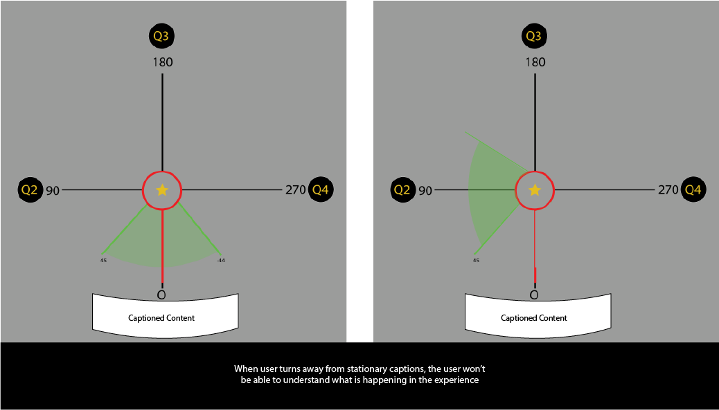While the Gamasutra article by Ian Hamilton, "How to Do Subtitles Well, Basic and Good Practice" [4] breaks down the issues and concerns regarding subtitles in traditional gaming, the author had a very pointed observation on the issue of captioning in VR. In the article, the author specifically notes, "There is a really significant issue with subtitling/captioning in VR - the general lack it...". That simple note, however brief, is largely indicative of the current situation in VR gaming right now. A glaring example of this issue can be seen in the AAA VR Game, “Vader Immortal”. In this game there is an accessibility feature that is supposed to enable visual feedback for the hard of hearing. Upon playing the game however users realized that those features were inadequate, as many users reported that the game was still inaccessible to them even with the feature turned on . The issue of captioning in Virtual Reality has many layers, but the greatest issue that plagues developers most is the concern of where to place the subtitles. Unlike the traditional captioning method of console games, where the main display camera is to one position on the screen, Virtual Reality is a medium where the position of the display camera changes rapidly from minute-to-minute. [fig3.1.2]