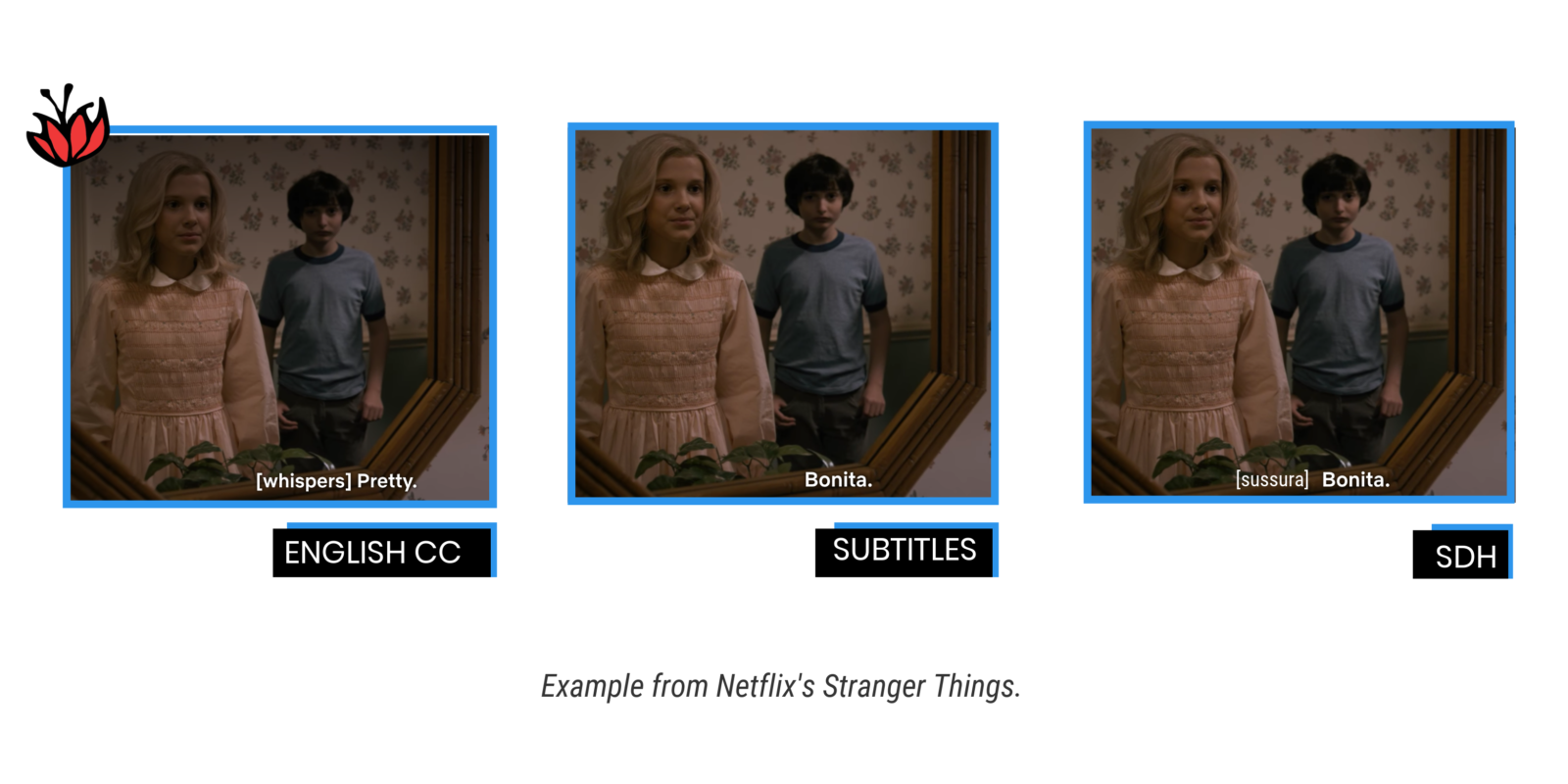 Now to explore one of the gravest issues affecting the barrier of entry for the Deaf and Hard of Hearing getting into VR, the issue of captioned information. Before diving into this topic, is worth noting that in entertainment media there exists a clear distinction between the purpose of subtitles and closed captioning. 3PlayMedia.org’s article on the Ultimate Guide to Closed Captioning [5] states that subtitles only include translation for spoken word, as it was made assuming the viewers could ear but doesn’t understand the language. Closed captioning however were made assuming the viewer is Deaf or Hard of Hearing and include descriptions of sounds in the environment, in addition to spoken text, in it’s translations. An example of this distinction can be found in the figure below [fig 3.1.3].