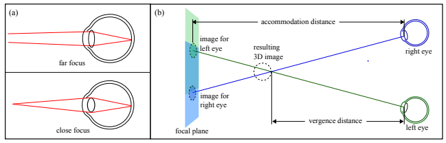 One of the main issues when developing accessible products in VR is the issues of the Vergence-Accommodation Conflict or VAC. The Adrienne Hunter’s medium.com article “Vergence-accommodation conflict is a bitch...” explores the issue of VAC as an issue how the human eyes naturally focus on an object, and the complications that arise with VR from having to include a display screen in-between the display object. As stated by Hunter [2], “ ...the way that the lenses of your eyes focus on an object is totally separate from the way that your eyes physically aim themselves at the object you’re trying to focus on.”. In VR users are required to first look at a display screen before focusing on objects further away in the virtual space, which can often lead to eye strain. [fig 3.1.1]